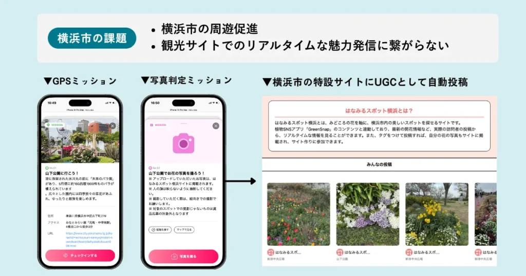 本施策では、周遊促進はもちろんのこと、「横浜市の特設サイト(はなみるスポット)内の投稿写真が少なく、その後の波及効果が限定的である」という課題を解決するため、以下のような設計にしました。